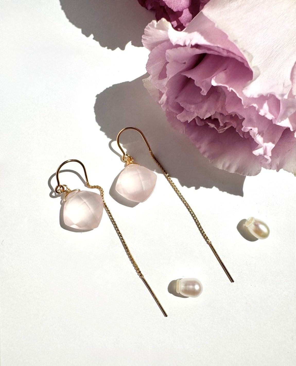 クッションカットが美しい上質なローズクォーツを使用、耳の後ろから繊細なチェーンが揺れて女性らしい柔らかな雰囲気を演出してくれます。