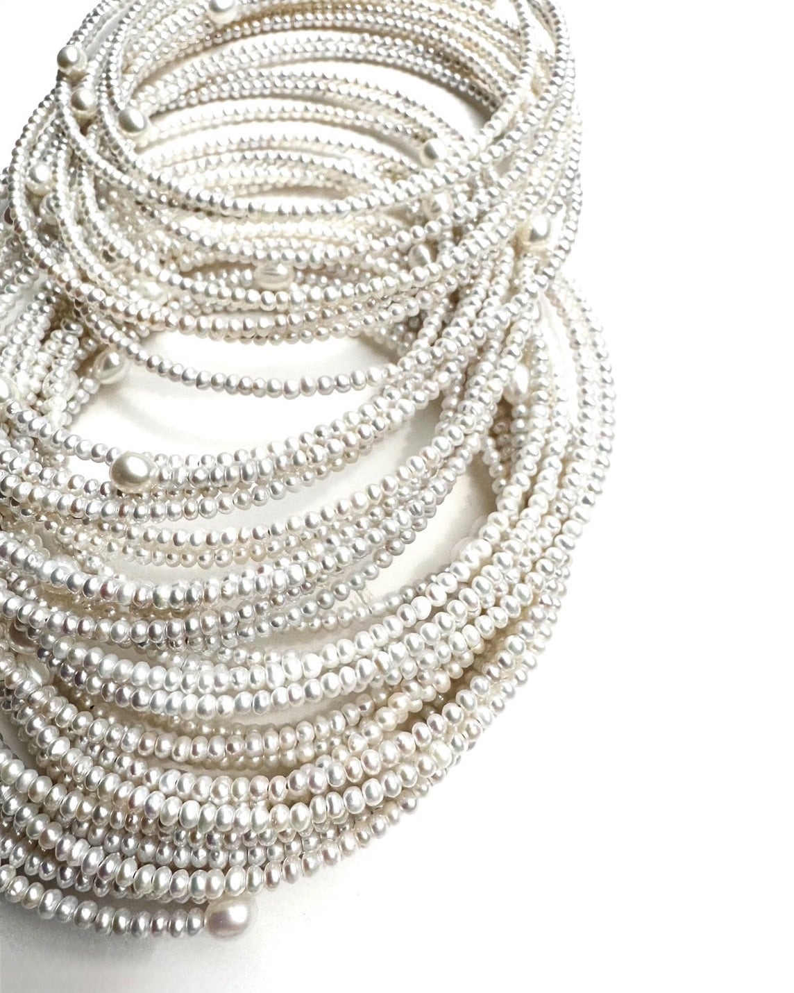 形状記憶のパールチョーカーは着脱も簡単で、前後どちらを前に付けても様になります。着けているのを忘れる位、軽くコーディネートのポイントとして活躍してくれます。