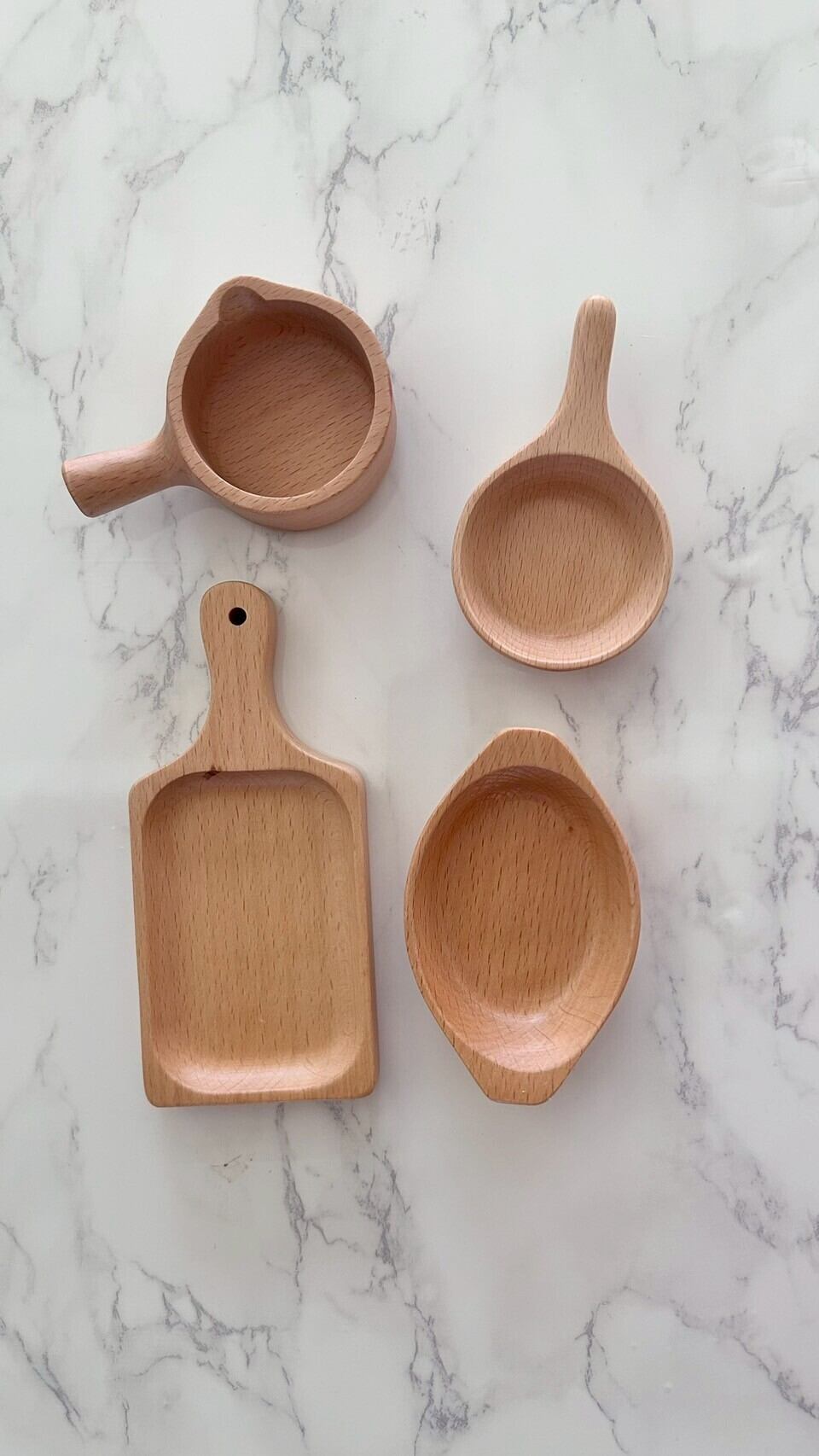 フライパンやグラタン皿、ミルクパンなどキッチンツールを小さく型どった木製豆皿。
