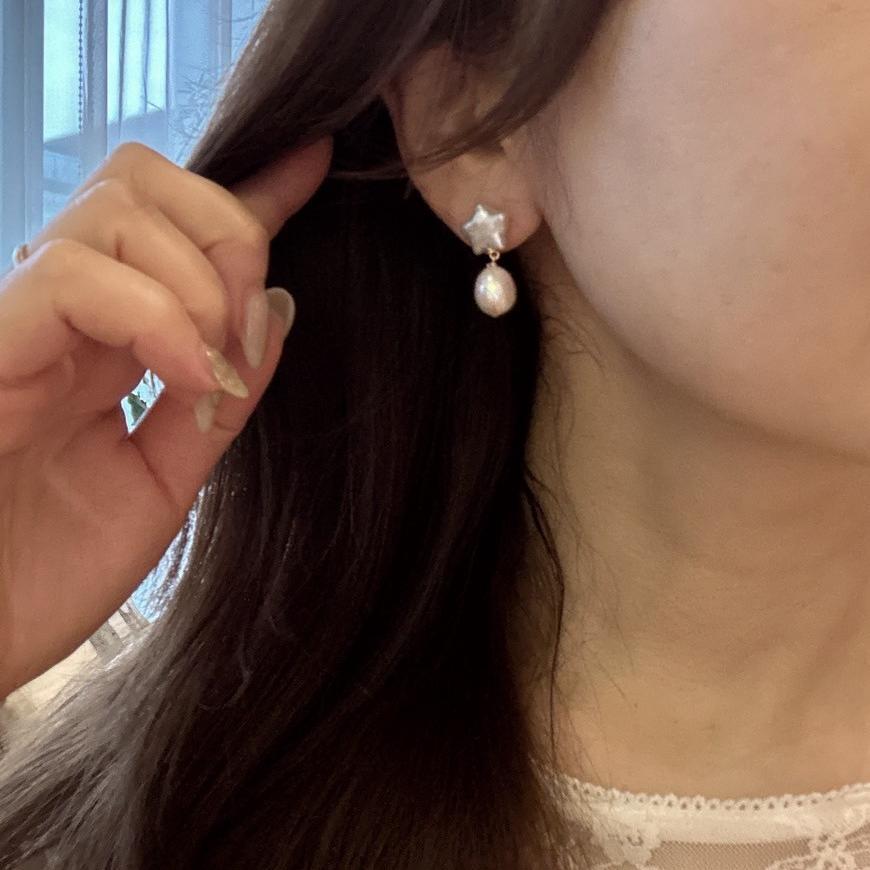 モダンな遊び心を感じさせる星のフォルムに、落ち着いた気品を添えるパールのドロップ。