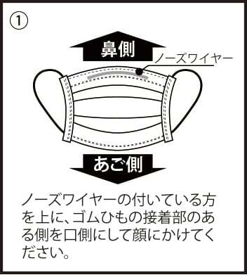 ノーズワイヤーの付いている方を上に、ゴム紐の接着部のある側を口側にして顔にかけ、鼻のカーブに合わせて上下に伸ばし、マスクの下側が顎の下に来るようにしてください