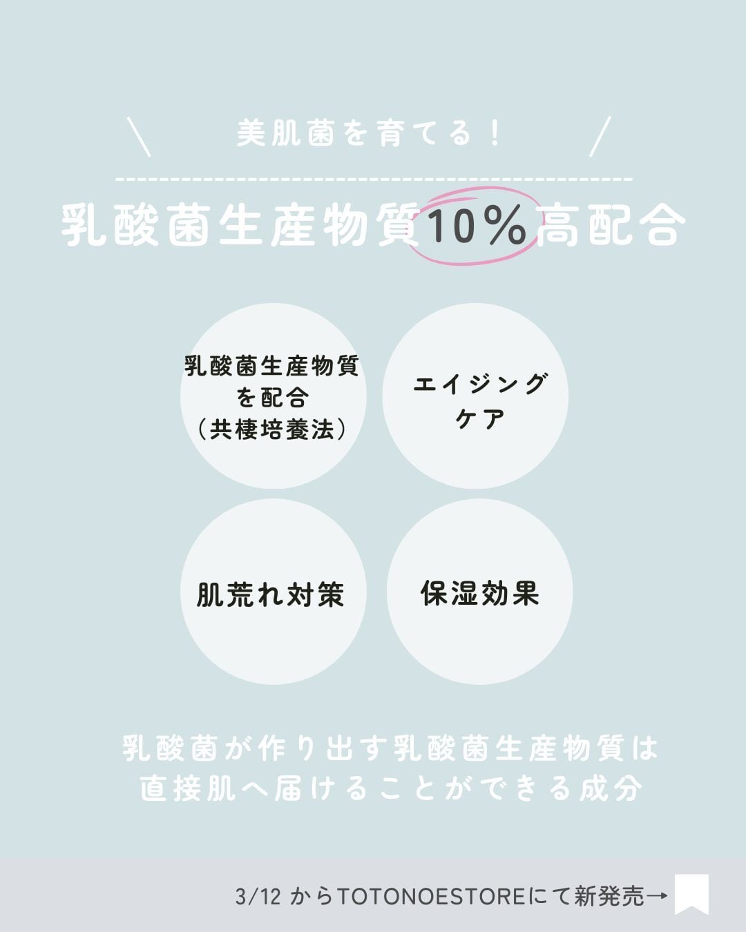 乳酸菌が作り出し、自らの美肌力を高める「乳酸菌生産物質」を日本で初めて10%も高配合することに成功。
