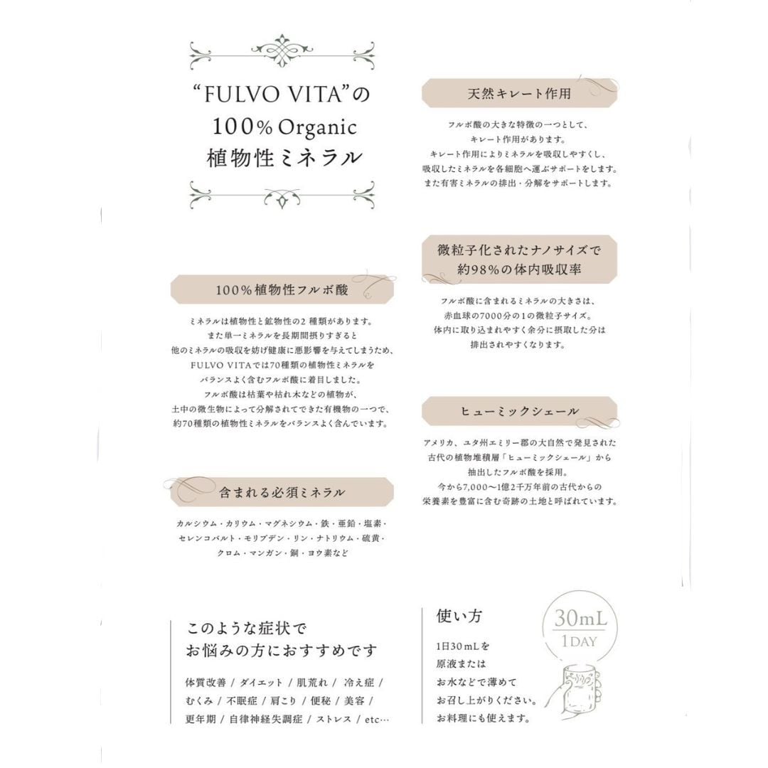 その中でも奇跡といわれている植物性ミネラルである70種類以上をバランスよく含まれているフルボ酸を厳選し、100%organicの品質と安全性の高さにこだわりを持っています。