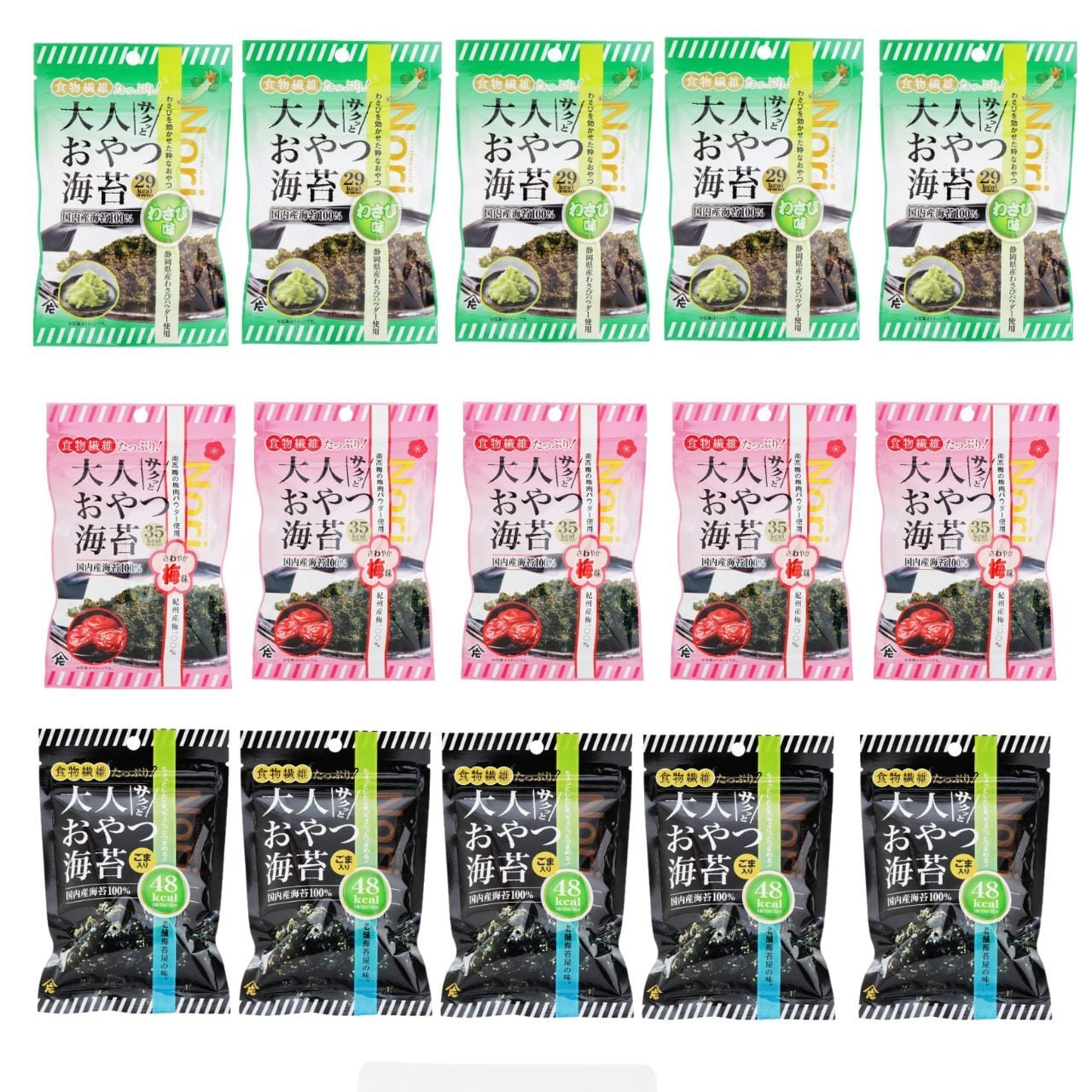 ★大人おやつ海苔 (わさび、梅、ごまx各3つ) ちょっとおやつを食べたいけどカロリーが気になる・・・。 そんな時にピッタリ! 海苔の栄養がたっぷりの「サクッと大人おやつ海苔」 海苔を手軽に楽しめます。 名称:味付けのり 原材料名:乾のり(国内産)、砂糖、ごま、醤油(大豆・小麦を含む)、味醂、デキストリン、唐辛子/トレハロース、調味料(アミノ酸等) 内容量:13g 賞味期限:9ヶ月 保存方法:高温多湿、直射日光を避けて常温で保管してください