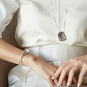 特別な加工を施しており、変?や剥がれ等が起きにくく軽減され、手軽にシルバーの雰囲気を楽しめます。銀製品同様、時間が経つにつれて黒ずんできますが、その場合はクロスなどで優しくお拭き取りください。プレーティングですので、付けたまま入浴や、水仕事などはおやめください。